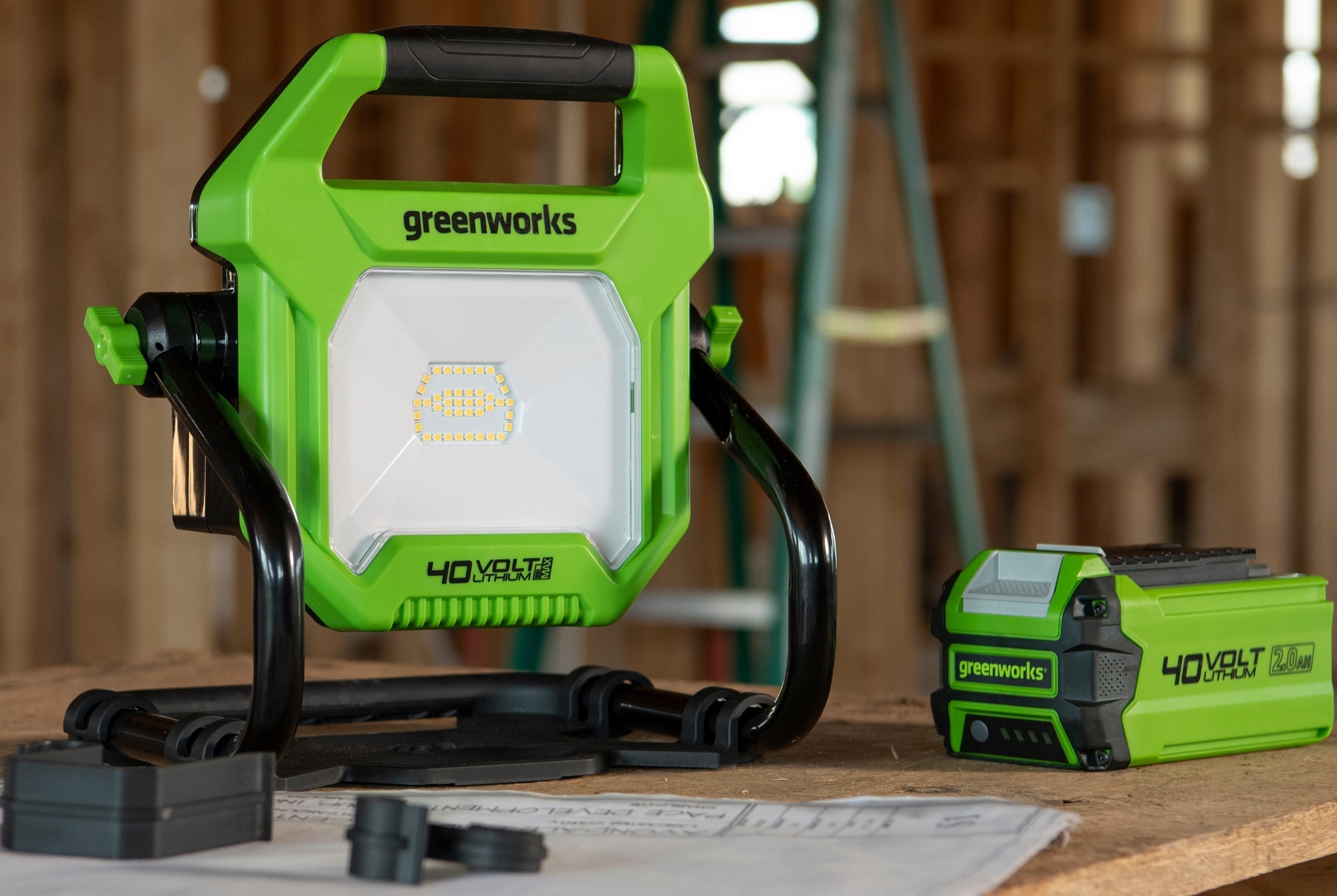 LED-прожектор представляет собой гибридную модель, способную работать как от сети 220-240 В, так и от сменных аккумуляторов линейки Greenworks 40 В. Устройство оснащено 42 светодиодами и обеспечивает два режима яркости — 1000 лм и 2000 лм. Индекс цветопередачи превышает 80, а цветовая температура составляет 5000±250 К.