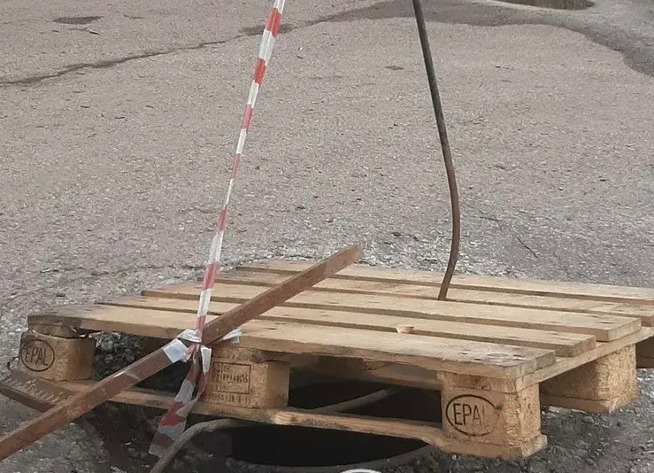 Люк не накрыли даже после того, как в него провалилось колесо машины. Вместо этого опасное место накрыли деревянным сооружением.