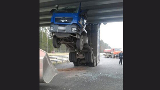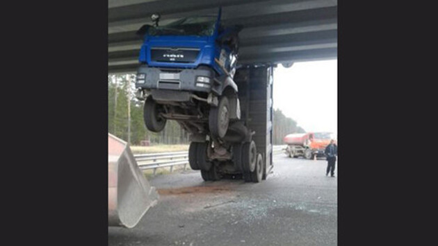 В Тверской области грузовик повис под мостом трассы Москва - Петербург