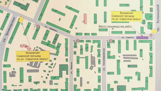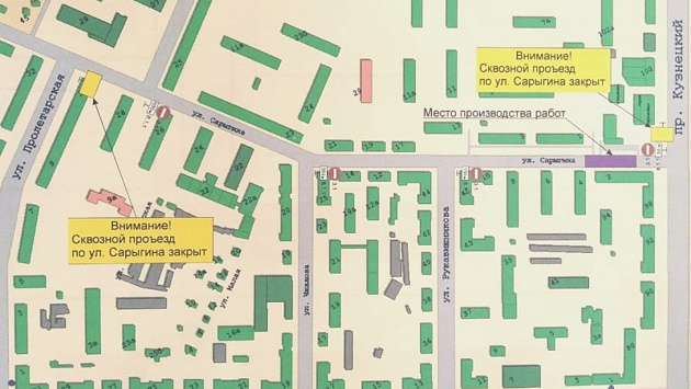 Как отмечено на предложенной схеме, перекрыт будет участок от проспекта Кузнецкого до улицы Пролетарской. Сами работы будут проходить недалеко от пересечения Сарыгина с Кузнецким. Автомобилистов призвали ехать в объезд.