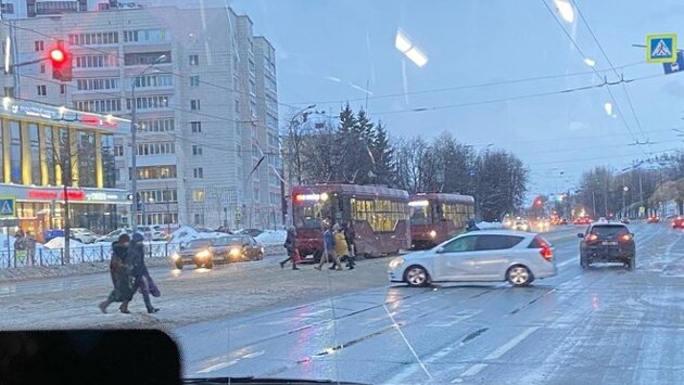 На улице Ершова в обе стороны не могут проехать трамваи. Проезд им перегородили два столкнувшихся автомобиля.