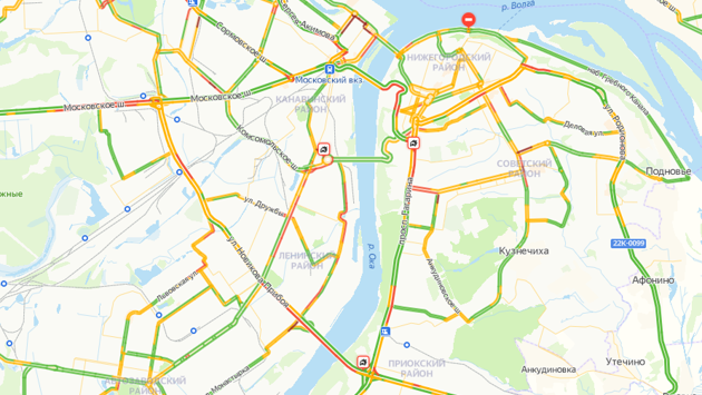 Нижний Новгород «встал» в пробках утром 19 февраля. Информация об этом появилась на «Яндекс. Картах».