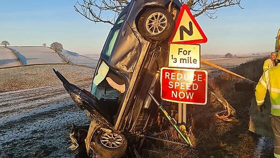 Фотографии с результатами аварии, случившейся рано утром, 9 января на трассе A623, в окрестностях населённого пункта Тайдсвелл (графство Дербишир, Британия) были размещены на сайте местного полицейского управления.