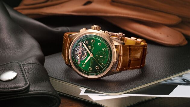 «Изюминка» часов – турбийон Breitling, который виден за циферблатом, выполненным в легендарном темно-изумрудном цвете British Racing Green. Механизм Breitling Manufacture Calibre B21, который приводит в движение стрелки часов, обеспечивает до 55 часов запаса хода и водостойкость на глубине до 100 метров.