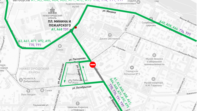 Также изменятся маршруты нескольких автобусов: А-1, А-3, А-40, А-58, А-61, А-64, А-68, А-71, А-92, А-95, Т-70, Т-74, Т-91 и Т-97. Они будут двигаться по улицам Варварской, Октябрьской, Ошарской и Пискунова в направлении к площади Минина и Пожарского и по улицам Варварской, Пискунова, Алексеевской и Октябрьской в направлении к площади Свободы. Для всех этих автобусов и маршруток до 19 апреля будет введена новая остановка «Черный пруд».