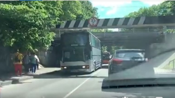 В Калининграде туристический автобус застрял под мостом на улице Островского. Авария попала на видеорегистратор одного из калининградцев, который выложил запись на своей странице Facebook. На ней видно, как задняя часть автобуса уперлась об известный в Калининграде «мост глупости». На улице стоят пассажиры с туристическими рюкзаками. По всей видимости, водителю придется прибегнуть к стандартной в таких случаях процедуре – спустить шины, а потом накачать. Последним, кто потерпел неудачу на улице Островского, был водитель бетоновоза. Его машина застряла в апреле этого года.