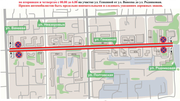 На Генкиной ограничения будут действовать на участке от ул. Ванеева до ул. Родниковой, а на Рокоссовского — от ул. Маршала Малиновского до ул. Генерала Штеменко.