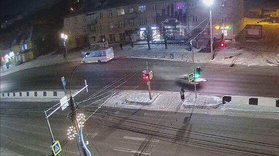Пожилая женщина перебегала дорогу на красный сигнал светофора и в нескольких метрах разминулась с легковушкой, которую закрутило от резкого торможения после избегания столкновения. В итоге машина врезалась в ограждение, а женщина окинула взглядом последствия инцидента и пошагала спокойно прочь.