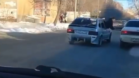 В это время из окна ВАЗа, продолжающего движение, вылез молодой человек, который начал кулаком бить проезжающую мимо Toyota. Когда машины затормозили, агрессор открыл дверь и выскочил из салона «девятки». Тогда водитель Toyota резко сдал назад и едва не наехал на «боксера».
