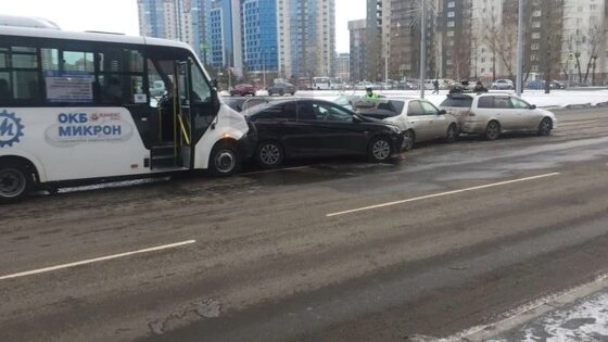 В Красноярске на улице Добровольческой бригады, 23, автобус «Луидор» столкнулся с 4 автомобилями. Один из пассажиров обратился за помощью к врачам.