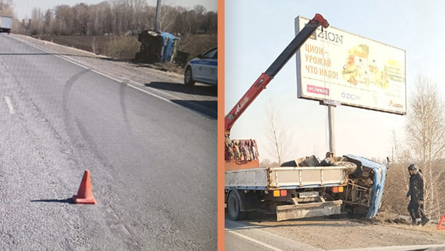 Под Новосибирском опрокинулся грузовик — он врезался в большегруз, а потом в рекламный щит