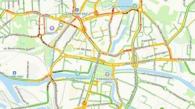 В центре Калининграда днём в пятницу, 8 июля, собрались километровые пробки. Об этом говорят данные сервиса «Яндекс.Карты».