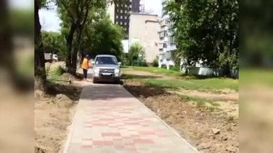 Мужчина на иномарке проехал прямо по тротуару на ремонтируемой улице Мухина. Ему высказали, что плитка не успела осесть и под весом автомобиля она может провалиться. Тогда придётся переделывать всё заново. Но мужчина лишь сказал, что он виноват, и спросил, как выехать на проезжую часть.