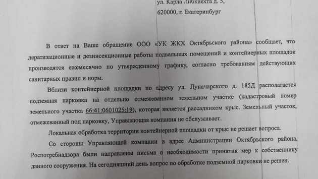 «Со стороны управляющей компании в адрес администрации Октябрьского района, Роспотребнадзора были направлены письма о необходимости принятия мер к собственнику данного учреждения. На сегодняшний день вопрос по обработке подземной парковки не решен», — говорится в ответе на запрос журналистов.
