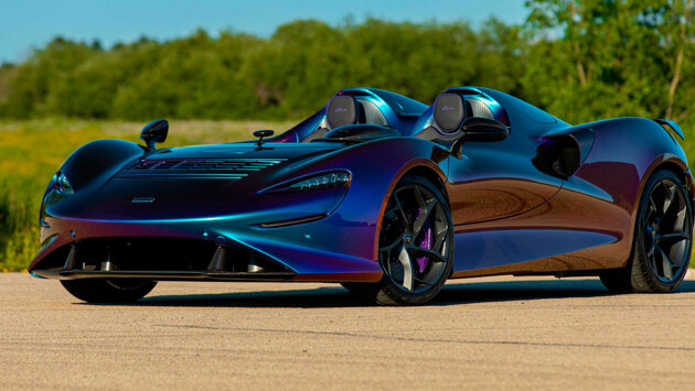 Pacific Color Stream, можно описать более понятным термином «хамелеон». Краска сочетает в себе оттенки синего, фиолетового, розового, оранжевого и красного цветов и в итоге окраска автомобиля меняется в зависимости от угла обзора. Что касается отделки салона, то он выполнен из неокрашенного углепластика и фирменного черного текстиля Ultrafabric. При массе 1198 килограммов Elva — это самый лёгкий серийный автомобиль McLaren, весящий даже меньше, чем гиперкар McLaren Senna. Спидстер оснащается бензиновым битурбомотором V8 4.0 мощностью 815 лошадиных сил и 800 Нм крутящего момента и работает в паре с 7-ступенчатым преселективным «роботом». Особенность модели — активная система управления воздушными потоками AAMS (Active Air Management System), способная создавать воздушный «купол» над кокпитом. Стоимость «хамелеон» McLaren Elva не названа, а нового обладателя постараются найти во время аукциона Mecum, который состоится в августе в калифорнийском Монтерее. Новый спидстер, напомним, стоил 1,69 миллиона долларов.