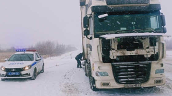 В Пензенской области сотрудник Госавтоинспекции помог водителю сломавшегося большегруза в период снегопада