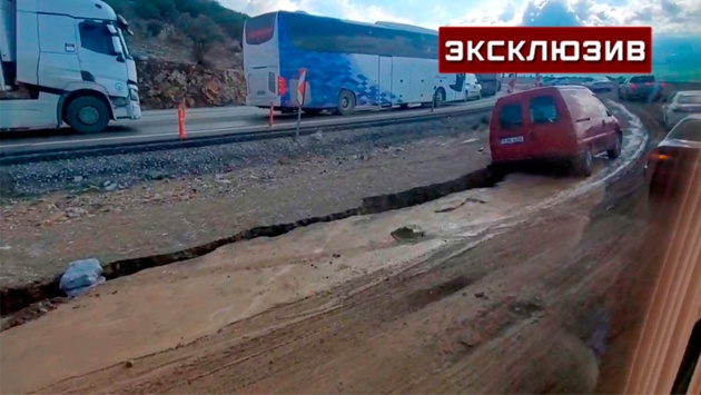 В результате сильных землетрясений в Турции на дорогах появились большие разломы, в которые упали автомобили. Застрявшие транспортные средства мешают проезду других машин, создавая тем самым многокилометровые пробки.