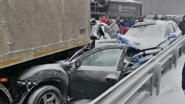 В результате сильного снегопада, гололеда и плохой видимости более 30 грузовых и легковых автомобилей столкнулись в одном месте, что заблокировало движение на трассе.