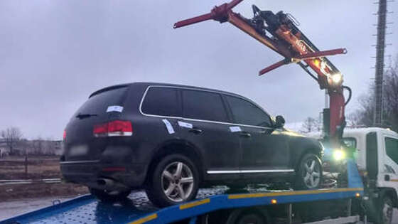 Приставы арестовали Volkswagen Touareg, у которого не было переднего бампера, и отправили его на спецстоянку. Если владелец не погасит задолженность, то кроссовер реализуют на торгах в счет долга.
