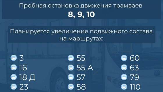 . Это связано среконструкцией саратовского трамвая. Пассажиров навремя остановки трамваев будут перевозить автобусы № 18Д, № 23, № 58, № 57, № 55, № 55А, № 63, № 60, № 3, № 79, № 16, № 26 и№ 110. ВСаратове навремя строительства скоростного трамвая закрывают шесть трамвайных маршрутов. Небудут ходить трамваи № 3, № 6, № 8, № 9, также будет приостановлена работа маршрутов № 4 и№ 10. Чтобы заменить этот транспорт,