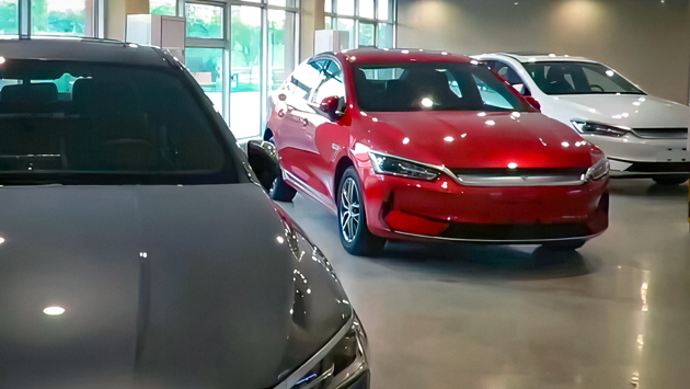 На фотографии, сделанной в выставочном зале салона, запечатлены два седана BYD Qin Plus в разных цветах и один кроссовер BYD Yuan Plus. Первый производится в Китае уже два года, и его можно купить в том числе в России — машины возят в страну усилиями дилеров. Седан, который по размерам чуть крупнее Skoda Octavia, представлен в гибридной и электрической версиях.