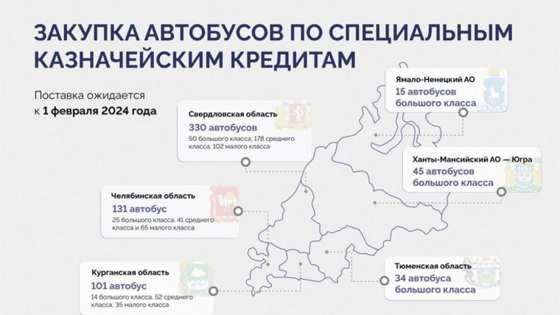 «Всем шести регионам УФО одобрены специальные казначейские кредиты на приобретение автобусов транспорта на общую сумму 4,88 млрд рублей. Техника должна быть поставлена к февралю 2024 года», — говорится в сообщении.