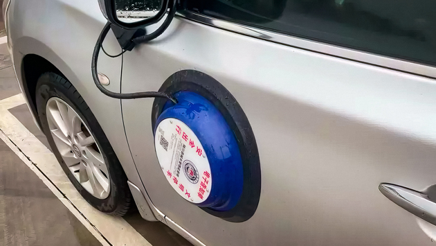 Устройство, напоминающее тазик, присасывается к двери автомобиля, а его провод оборачивается вокруг бокового зеркала заднего вида — чтобы присоска не осталась валяться на дороге, если вдруг отклеится.
