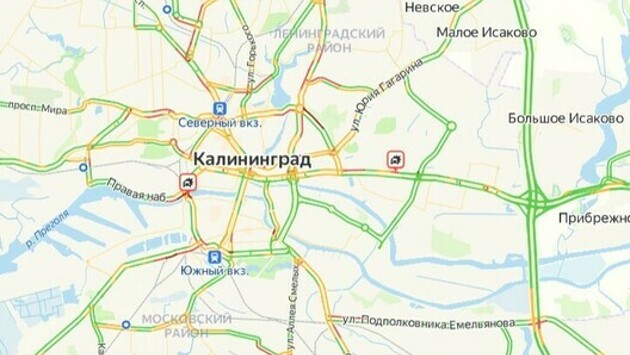 Машины стоят в заторах на основных магистралях города. Сообщается о двух ДТП — на Московском проспекте и Правой набережной. Общая дорожная ситуация в Калининграде оценивается в пять баллов.