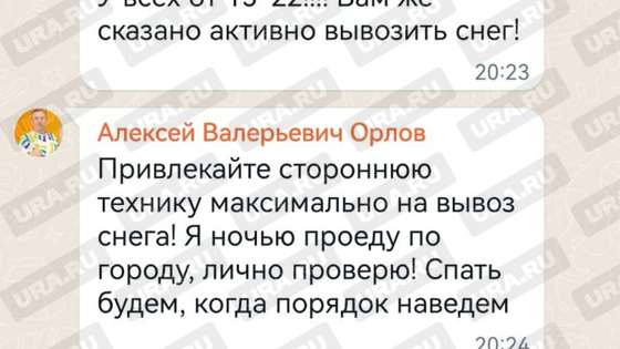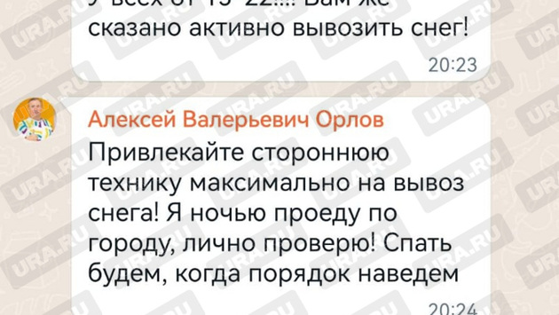 «Какие планы по выходу техники и людей в ночь по районам? Прошу мобилизовать все имеющиеся ресурсы, и технику, и людей, иначе придется общественный транспорт останавливать, что недопустимо абсолютно перед праздниками», — написал Орлов в 20:23 26 декабря. «У всех от 15-22!!! Вам же сказано активно вывозить снег», — тут же обратился к коллегам ответственный за уборку вице-мэр Алексей Бубнов. Участники чата говорят, что чиновник включается в беседы якобы в основном после того, как задачи начинает раздавать шеф.