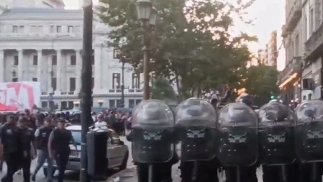 Сотрудники полиции выстроились в несколько рядов и оттеснили протестующих у Конгресса Аргентины подальше от здания, пытаясь сместить их с проезжей части дороги.