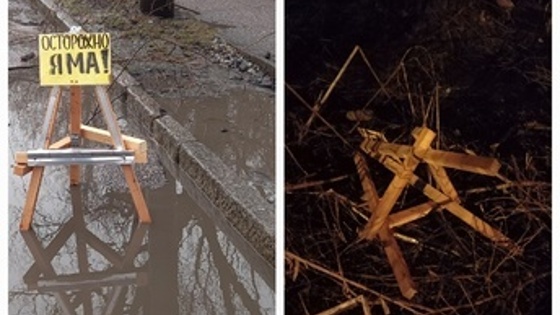 В Калининграде водитель соорудил предупреждающий знак для самой опасной ямы на Суворова. По словам автомобилиста, провал постоянно залит водой, и туда влетают машины. На деревянной треноге калининградец оставил надпись «Осторожно, яма!».