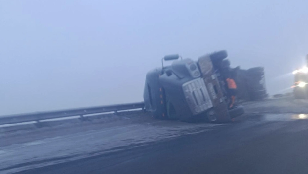 В Красноярске образовалась огромная пробка из-за перевернувшейся фуры