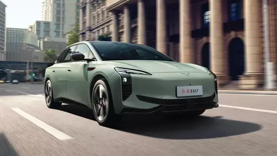 Hongqi EH7 представляет собой полноразмерный седан в стиле фастбэка с L-образными фарами, скрытыми дверными ручками, панорамной крышей и пятиспицевыми колесными дисками с красными тормозными суппортами Brembo.