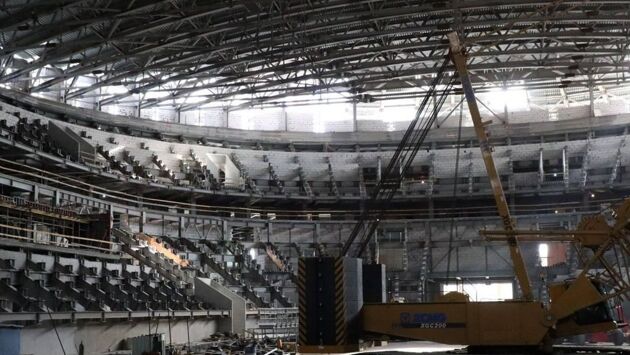 По словам Никитина, на данный момент устройство первого слоя кровли здания выполнено на 90%. Также продолжается прокладка инженерных сетей и монтаж настилов трибун. Кроме того, рабочие приступили и к отделке подтрибунных помещений.