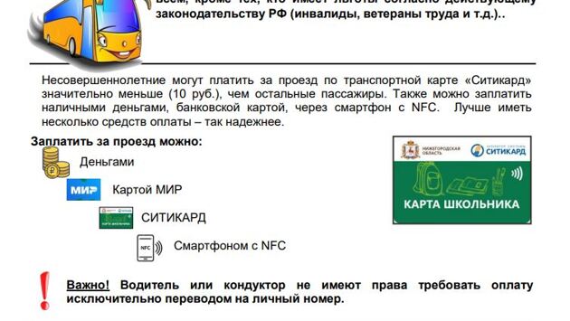 Министерство транспорта и автомобильных дорог Нижегородской области подготовило памятку для несовершеннолетних и их родителей о пользовании общественным транспортом. Памятку планируется разместить на сайтах школ и предприятий, а также разослать по «родительским» чатам и направить в подразделения территориального общественного самоуправления. Памятка создана совместно с департаментом образования администрации Нижнего Новгорода по итогам встречи представителей Центра развития транспортных систем, ГП НО «Нижегородпассажиравтотранс», ООО «Ситикард», ГУ МВД России по Нижегородской области с родительскими комитетами школ города. Особое внимание в памятке уделяют взаимодействию несовершеннолетних пассажиров с водителями и кондукторами наземного общественного транспорта. Так, если во время поездки возникли сложности, например, не читается карта, ребенок не знает, как добраться до нужного места, ему рекомендуется прямо из транспортного средства позвонить по телефону кол-центра пассажирских перевозок: +7(831) 422 – 28-25. По просьбе оператора кол-центра можно передать телефон для разговора водителю или кондуктору. При этом с водителем следует вести разговор только во время остановки. Специалисты кол-центра оперативно разберутся в ситуации, при необходимости обратятся к перевозчику. Родители также могут позвонить на этот номер с возникшей проблемой. Если у несовершеннолетнего пассажира не оказалось денег, ему рекомендуется не прятаться, а обратиться к водителю или кондуктору и честно объяснить ситуацию. Ранее перевозчикам Нижегородской области была направлена памятка для водителей и кондукторов, в которой указано на запрет высадки из транспорта несовершеннолетних. В связи с тем, что старшие школьники могут выглядеть старше своих лет, им рекомендуется иметь при себе документ, подтверждающий возраст. Это может быть копия свидетельства о рождении или школьный пропуск. В то же время в памятке внимание несовершеннолетних обращается на то, что при систематической неоплате проезда родители таких «зайцев» могут быть привлечены к административной ответственности. Детям рекомендуется выполнять следующие правила поведения в общественном транспорте: — при входе в транспортное средство снимать с плеч рюкзаки и объемные сумки, чтобы не доставлять неудобства другим пассажирам; — освободить для инвалидов, престарелых граждан, пассажиров с малолетними детьми и беременных женщин места в салоне, обозначенные специальными надписями или символами. Департамент образования администрации Нижнего Новгорода, а также районные отделы образования администраций городских и муниципальных округов нижегородской агломерации уже начали рассылать памятку в школы.