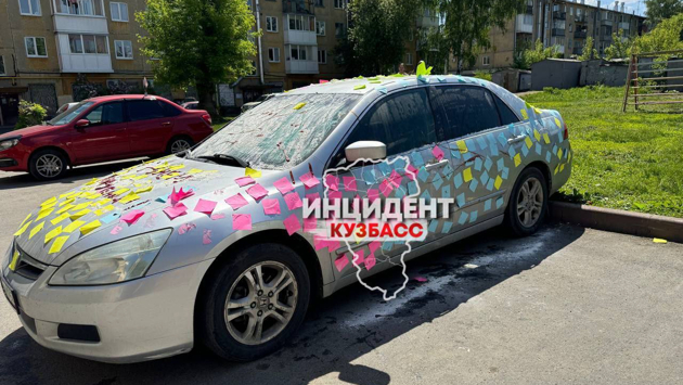 Пользователь социальной сети Telegram заметил в одном из дворов Кемерова легковой автомобиль, обклеенный цветными стикерами. На лобовое стекло машины рассыпано белое порошкообразное вещество, напоминающее муку. На капоте, вероятно, кетчупом, написано поздравление с днем рождения.