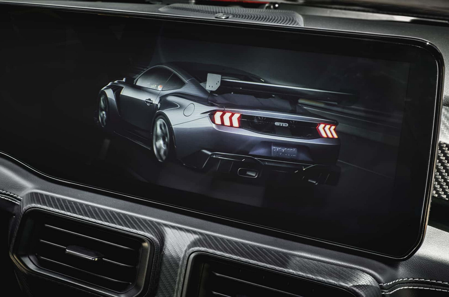 Хотя лимитированный Mustang GTD гораздо дороже обычных аналогов, в салоне разница в штрихах. Поменялись кресла (это тоже ковши, но без механизма откидывания и символикой на подголовниках), видоизменились подрулевые лепестки (теперь они титановые и с перфорацией), всюду появились углепластиковые вставки, заново отрисована графика цифровых приборов и тачскрина, а вместо заднего дивана — окошко для наблюдения за подвеской.