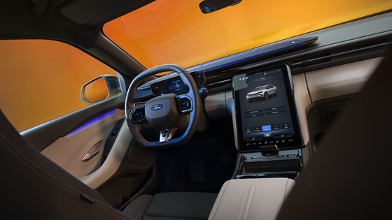 На разработке салона решили сэкономить и масштабировали то, что сделали для "Эксплорера": компактная приборка, вертикальный планшет мультимедиа, большой бокс между сиденьями, контурная подсветка.