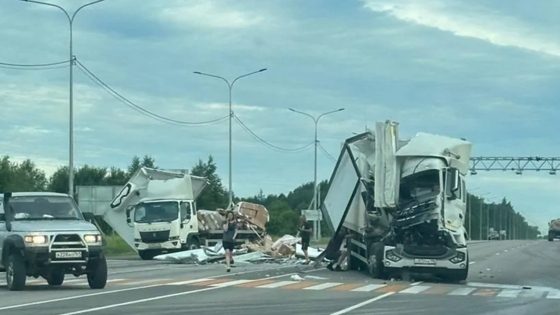 По предварительным данным, грузовик JAC с номерами из Санкт-Петербурга столкнулся сзади с «КамАЗом». Подробности о пострадавших пока не сообщаются, однако оба транспортных средства получили серьезные повреждения. У КамАЗа практически полностью разрушен кузов, часть груза оказалась на дороге, а у JAC повреждена кабина.