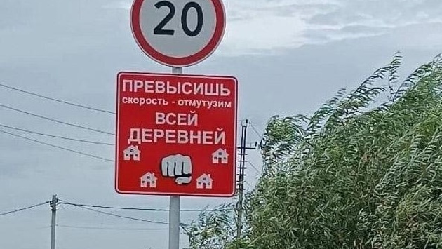 Вместо стандартных дорожных знаков, предупреждающих о скорости, они установили табличку с весьма специфическим посланием: "Превысишь скорость — отмутузим всей деревней". Табличка прикреплена на дороге, где максимальная скорость движения ограничена 20 километрами в час.