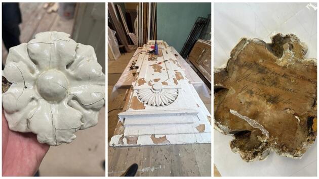 Сейчас двери, деталь с надписью находятся на реставрации. Специалисты расчистили все слои и добрались до самого первого. Изначально дверь была вовсе не белая. Она перекрашивалась много раз, была и коричневого цвета, и синего, и белого, и даже зеленоватого. А на одном из элементов реставраторы нашли слой сусального золота.