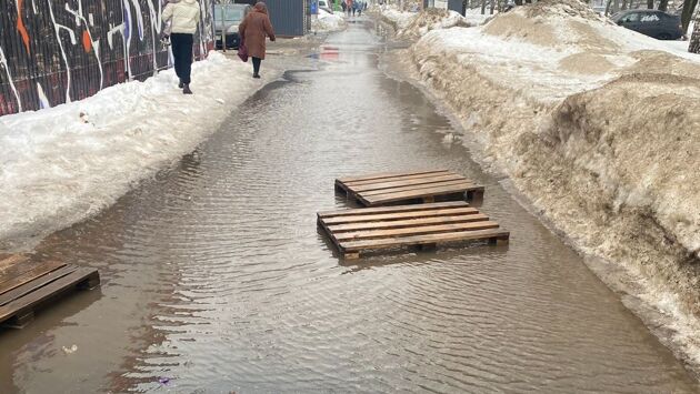 Затоплен тротуар на проспекте Дерябина, ведущий к стратегическому предприятию – концерну «Калашников»: «Идти возможно только по сугробам. Почистите, пожалуйста, или откачайте воду, или уложите настилы. Также грязь на плотине и на перекрестке, ботинки скрывает в этой жиже по подошву», – сообщает неравнодушный горожанин в группе «Благоустройство Ижевска».