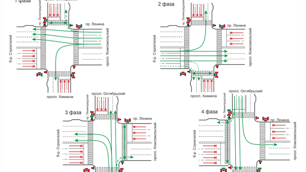 1 фаза: автомобили поедут по проспекту Ленина от проспекта Комсомольского, пешеходы пойдут через проспект Ленинградский со стороны проспекта Октябрьского; 2 фаза: транспорт по проспекту Ленина от бульвара Строителей и пешеходы через Ленинградский со стороны Химиков; 3 фаза: транспорт по Ленинградскому от Химиков и пешеходы через Ленина со стороны Комсомольского; 4 фаза: движение транспорта по Ленинградскому от Октябрьского и пешеходов через Ленина со стороны Строителей.