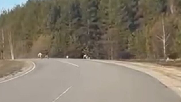 В подтверждение информации министерство опубликовало кадры, на которых молодые лоси перебегают дорогу перед машиной.