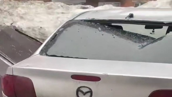 В Таштаголе с крыши дома по адресу Дзержинского, 17, упал кусок кровли. Он разбил стекло и оставил вмятину на припаркованном автомобиле.