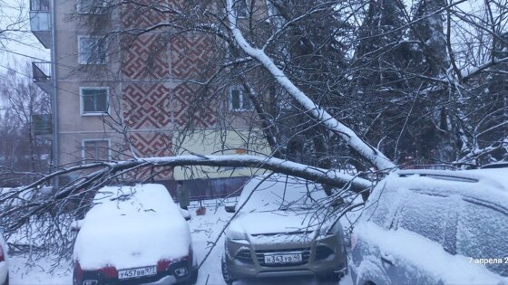 Четырем автомобилям, припаркованным во дворе дома № 41 на улице Ленина в Калуге, потребуется ремонт. Их помяло дерево, не устоявшее под тяжестью снега. К счастью, пострадали только машины. По словам местных жителей, они давно просили спилить это и другие аварийные деревья во дворе но их просьбы игнорировались. По данным Минстроя, всего в Калужской области в выходные упали более 420 деревьев. Они стали причиной многочисленных аварий на линиях электропередачи. Последствия аварий устраняются до сих пор.
