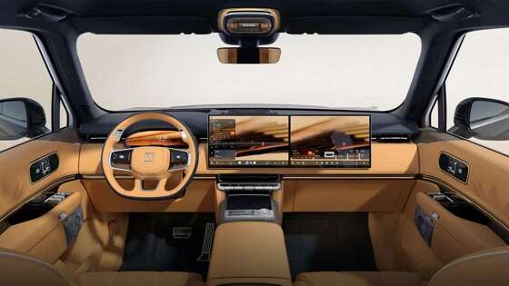 Внутри автомобиля предусмотрено шесть мест, два 16-дюймовых экрана спереди и большой экран для задних пассажиров. Сиденья оснащены электрорегулировками, подогревом и вентиляцией, а в пневмоподвеске используются адаптивные амортизаторы.