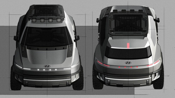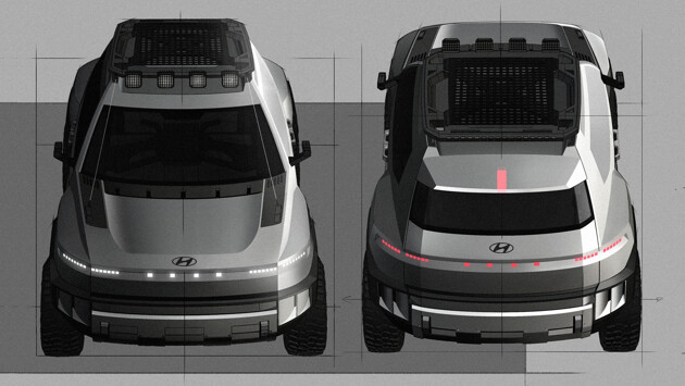 Судя по скетчам, пятидверный хардкорный внедорожник получил весьма брутальную внешность, «пиксельную» головную оптику узкой формы, агрессивно оформленную нижнюю часть переднего бампера, на крыше можно увидеть багажник с дополнительной светотехникой в передней части. Ещё у Hyundai Crater высокая «талия», узкая линия бокового остекления.