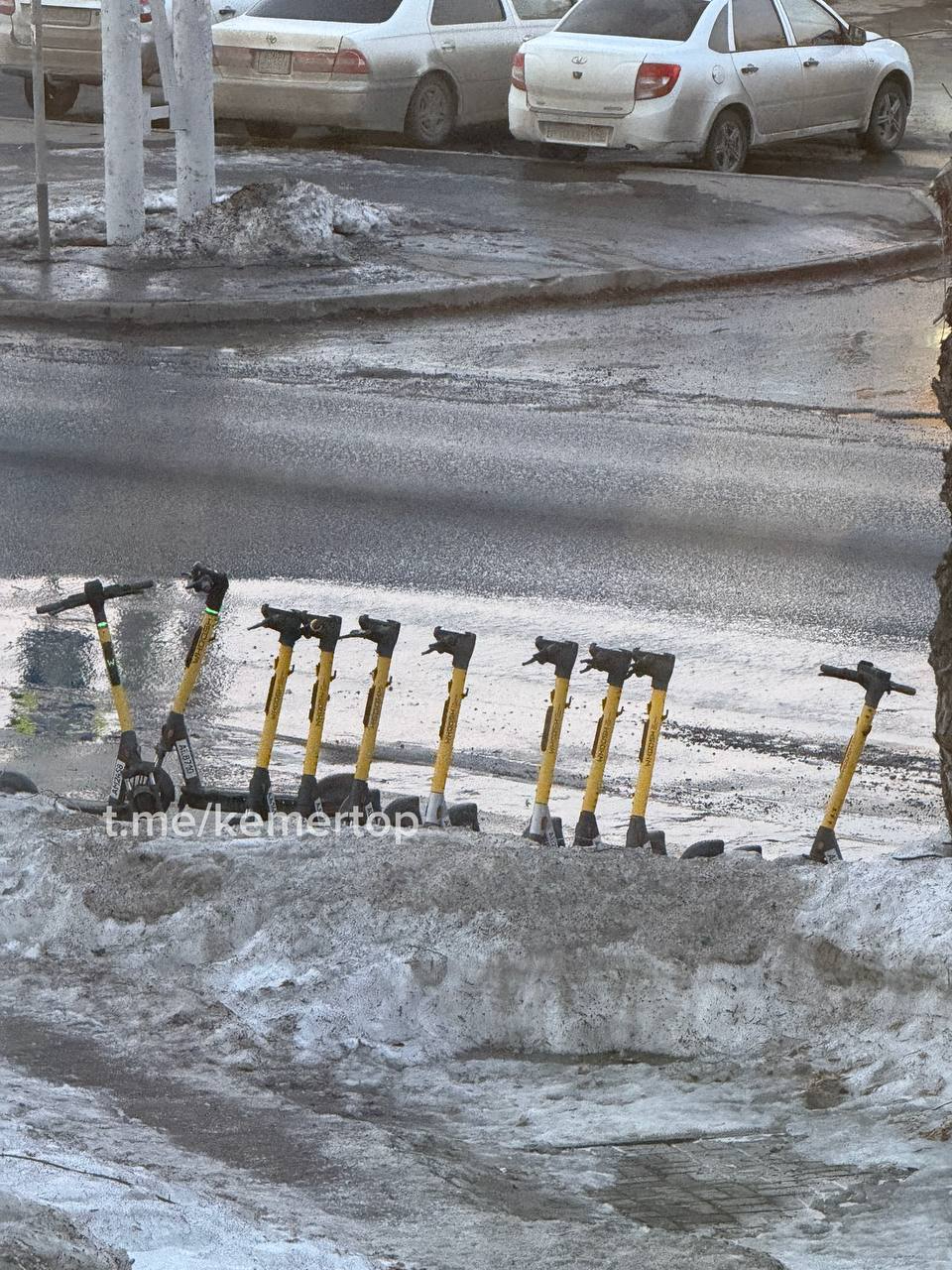 Кемеровчане рассказали в соцсетях, что на улицы вернулись электросамокаты – замечены выстроенные в ряд жёлтые аппараты Woosh. Владельцев не остановило месиво из грязи и снега на дорогах.