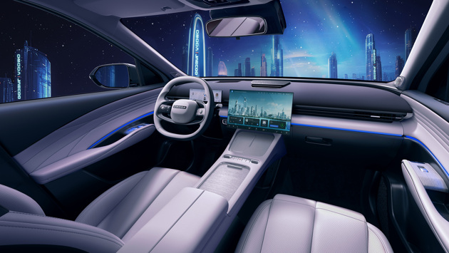 Салон кроссовер оснащен 15,6-дюймовым тачскрином и атмосферной подвеской на 256 цветов.